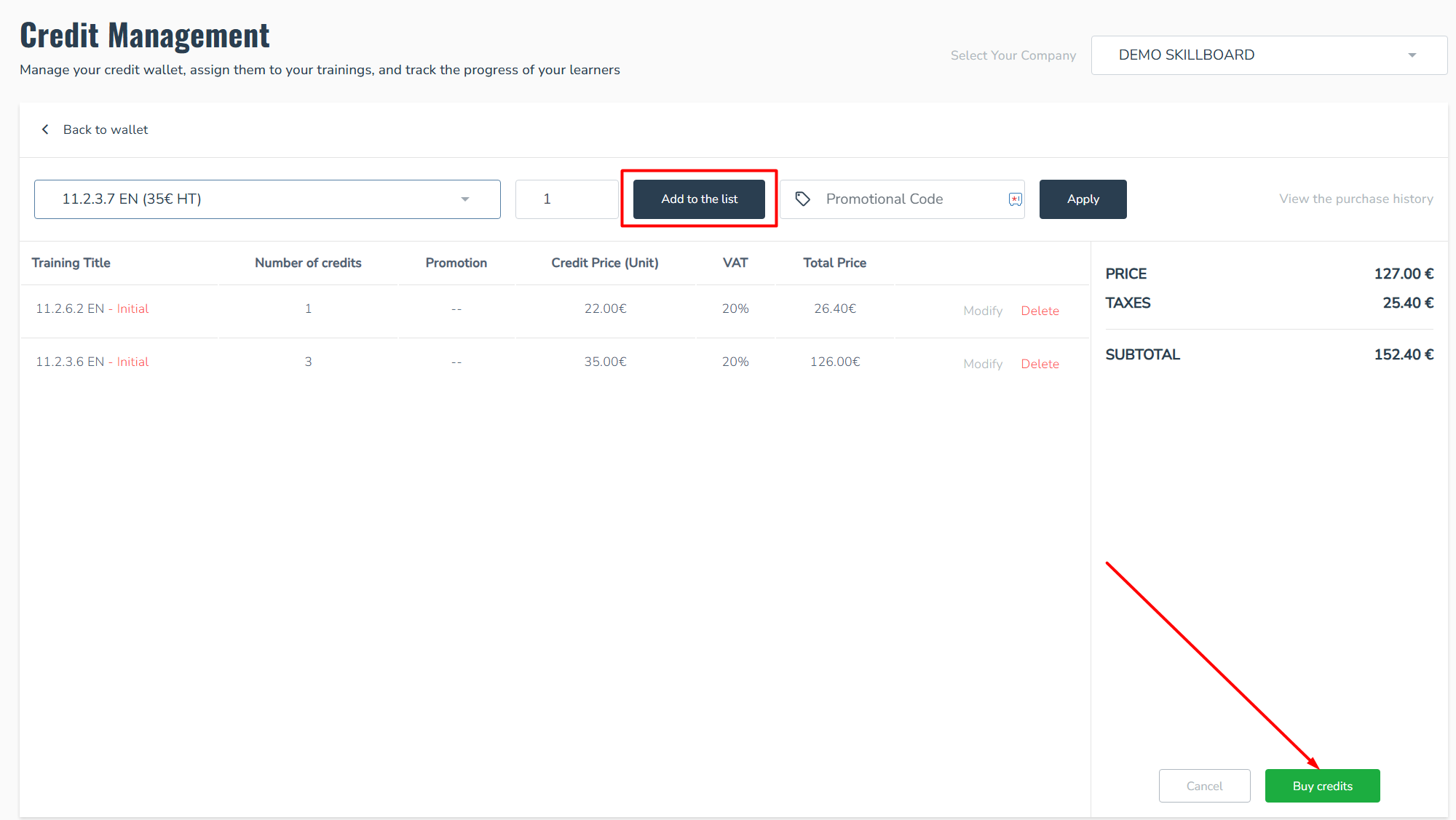 2) Create your training list with the “Add to list” button, then click on "Buy credits".